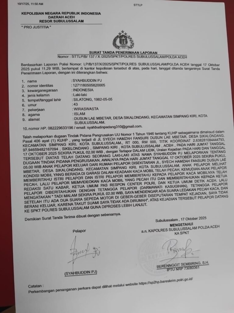 Kasus ini sudah dilaporkan oleh korban ke Polres Subulussalam dengan nomor laporan STTLP/B/137/X/2025/SPKT/POLRES SUBULUSSALAM/POLDA ACEH. Dalam laporannya kepada polisi, Syahbudin menekankan bahwa serangan tersebut terkait erat dengan profesinya sebagai wartawan.