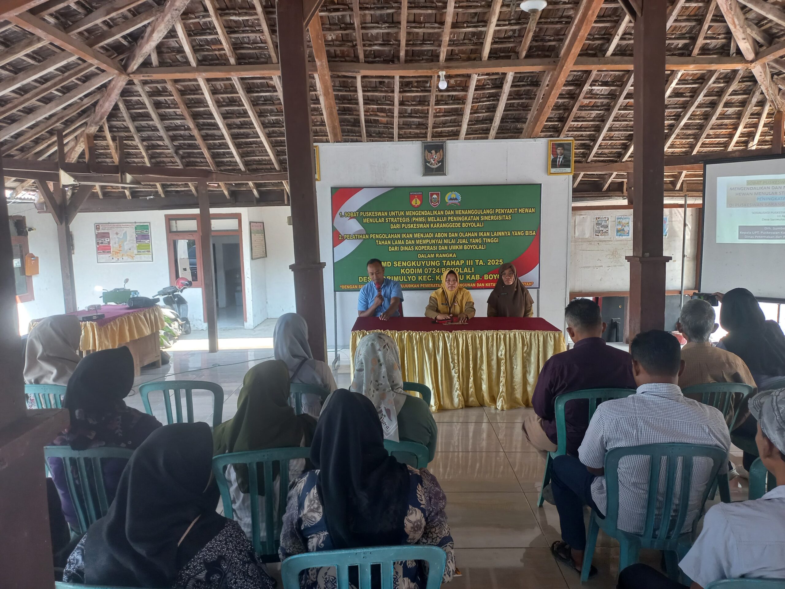 Boyolali, SUARABUANA.com – Untuk mencegah penyebaran penyakit menular pada hewan ternak, Satgas TNI Manunggal Membangun Desa (TMMD) Sengkuyung Tahap III Tahun 2025 Kodim 0724/Boyolali bersama Dinas Peternakan (Disnak) Kabupaten Boyolali melalui Puskeswan Karanggede menggelar sosialisasi pengendalian dan penanggulangan penyakit hewan menular. Kegiatan berlangsung di Aula Balai Desa Sarimulyo, Kecamatan Kemusu, Senin (11/08/25).