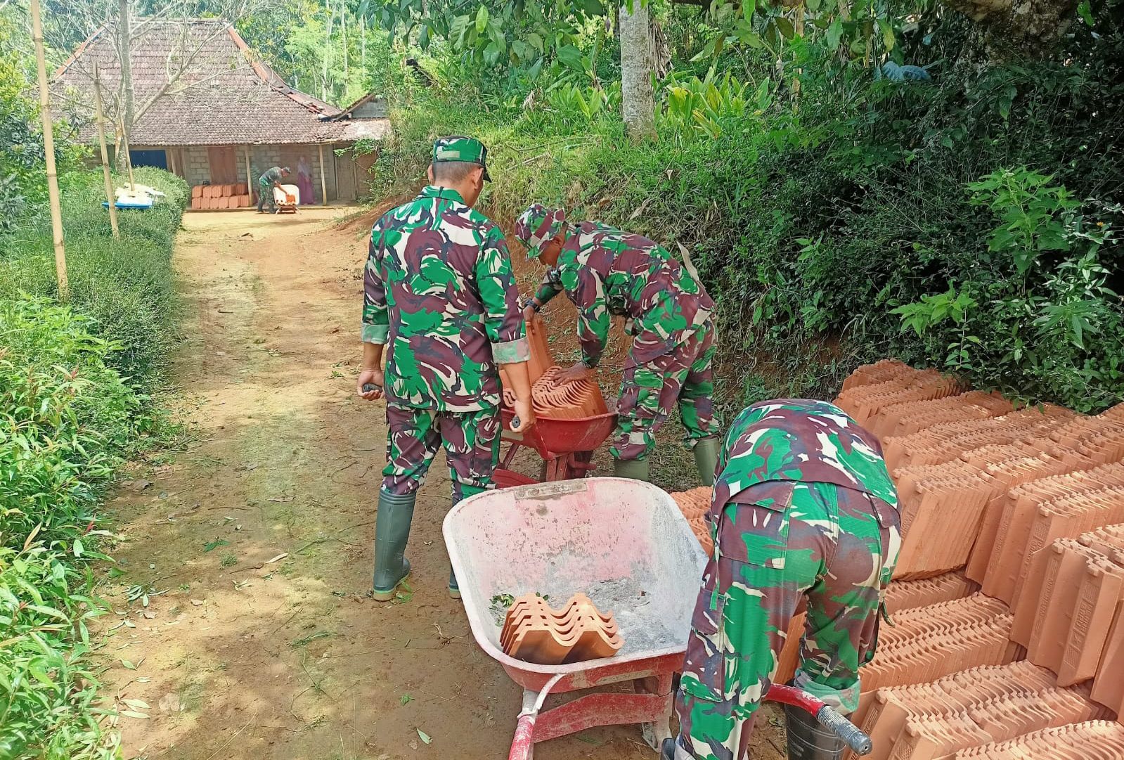 ‎Material genteng mulai didatangkan ke lokasi, dan proses bongkar muat dilakukan secara gotong royong oleh personel Satgas TMMD bersama masyarakat menggunakan angkong.