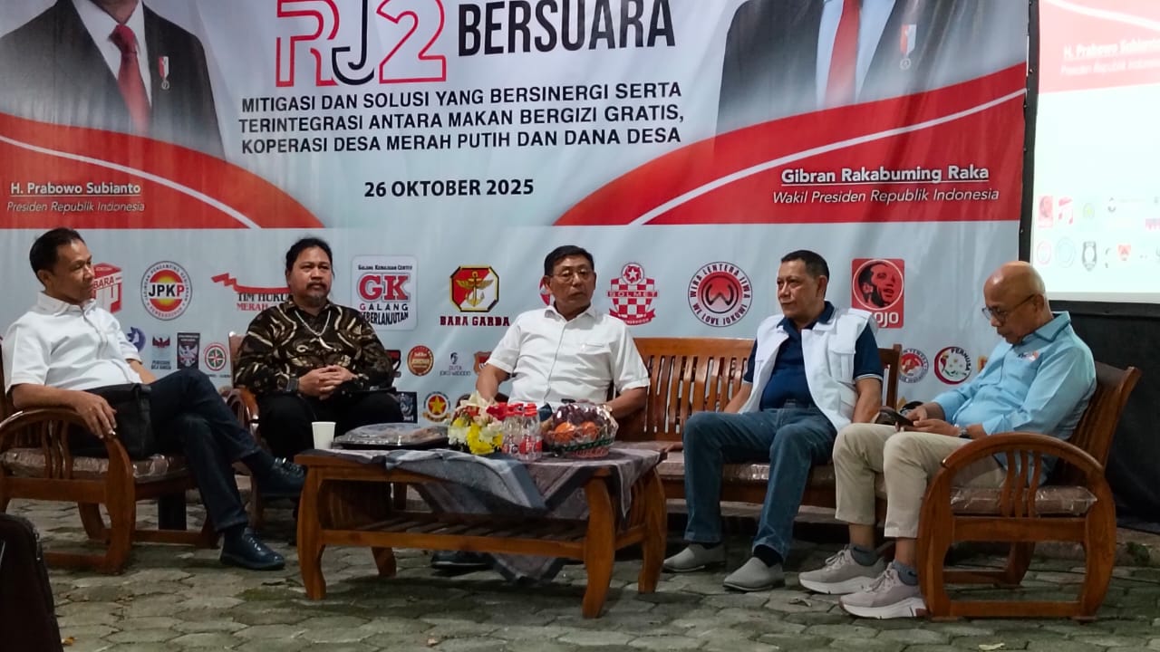JAKARTA, SUARABUANA.com Rumah Juang 2 yang sukses memperjuangkan terpilihnya Prabowo-Gibran menjadi Presiden dan Wakil Presiden RI kembali menggelar Forum Group Dicussion dengan tema ‘Mitgasi dan solusi yang bersinergi serta terintegrasi antara makan bergizi gratis, koperasi desa merah putih dan Dana Desa’ pada Minggu (26/10) di Rumah Juang Kawasan Cilandak, Pasar Minggu, Jakarta Selatan.