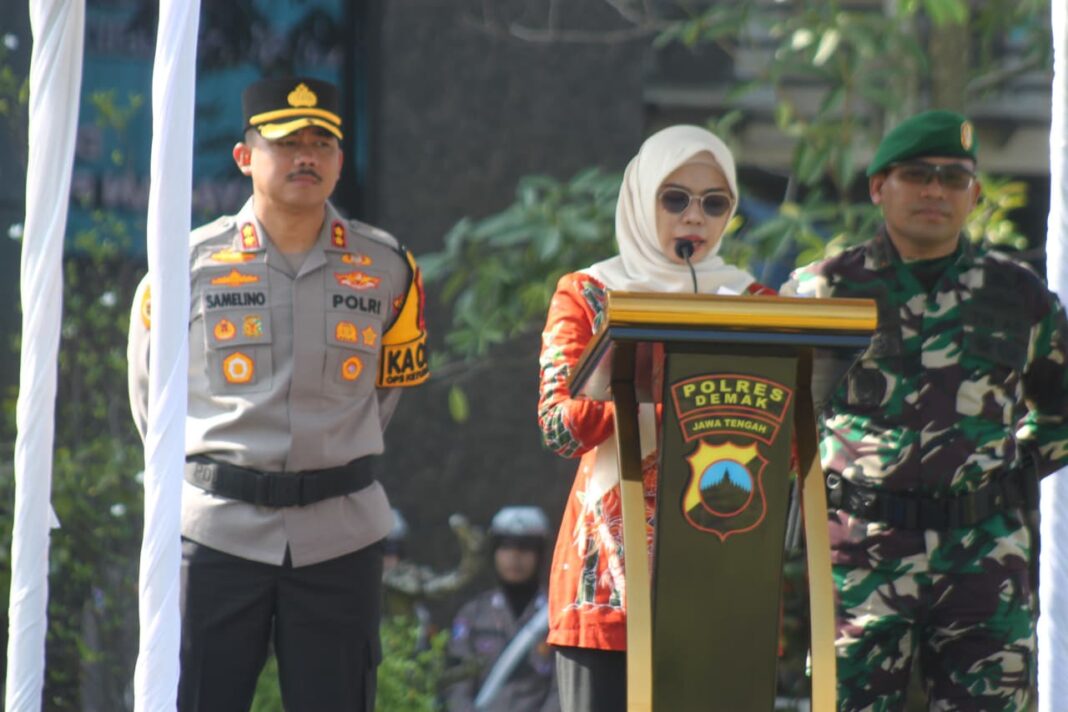 Demak, SUARABUANA.com – Polres Demak menggelar Apel Gelar Pasukan Operasi Ketupat Candi 2026 di Lapangan Wicaksana Laghawa, Kamis (12/3/2026). Apel tersebut menandai dimulainya operasi pengamanan arus mudik dan perayaan Idul Fitri 1447 Hijriah.Apel dipimpin Bupati Demak Eisti’anah dan didampingi Dandim 0716/Demak Dony Romansyah serta Kapolres Demak Arrizal Samelino Gandasaputra. Kegiatan tersebut diikuti personel dari TNI, Polri, Dinas Perhubungan, Satpol PP, Senkom, BPBD, Dinas Kesehatan, PMI, hingga Pramuka Saka Bhayangkara.Dalam amanatnya, Eisti’anah mengatakan apel gelar pasukan ini merupakan bentuk pengecekan kesiapan personel serta sarana dan prasarana pengamanan menjelang arus mudik Lebaran. Kegiatan tersebut juga menjadi wujud sinergi lintas sektor dalam memastikan pelaksanaan Operasi Ketupat Candi 2026 berjalan optimal.Menurut dia, operasi pengamanan ini digelar setiap tahun untuk memberikan rasa aman dan nyaman bagi masyarakat, khususnya para pemudik yang melintas maupun merayakan Idul Fitri di wilayah Kabupaten Demak.