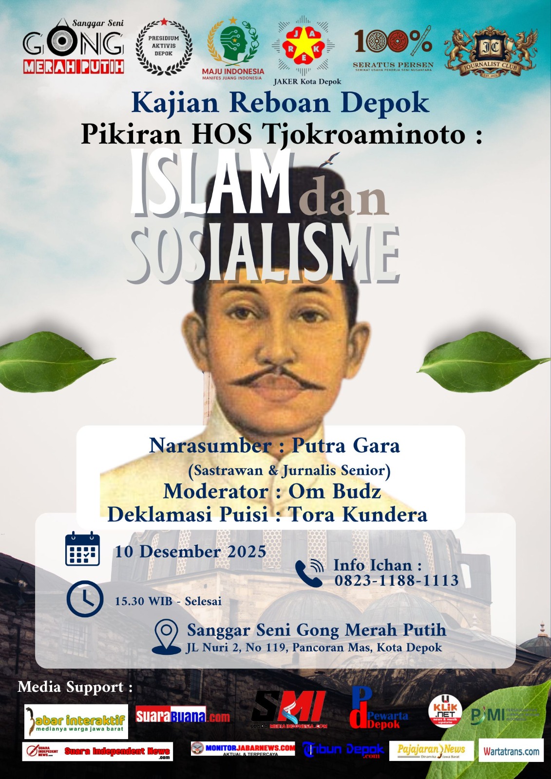 Forum Kajian Reboan edisi perdana akan membedah pemikiran HOS Tjokroaminoto berjudul “Islam dan Sosialisme” pada Rabu, 10 Desember 2025, bertempat di Sekretariat Sanggar Seni Gong Merah Putih, Depok Jaya. Narasumber utama adalah jurnalis senior sekaligus sastrawan Putra Gara, dan acara dipandu oleh aktivis kemanusiaan Samsu Budiman alias Om Budz.
