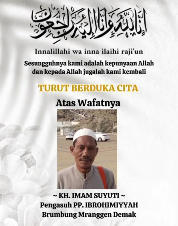 DEMAK, SUARABUANA.com – Innalillahi wa inna ilaihi raji’un. Kabar duka menyelimuti Kabupaten Demak, khususnya warga nahdliyin dan santri di wilayah Mranggen. Telah berpulang ke Rahmatullah, KH. Imam Sayuthi, Pengasuh Pondok Pesantren (Ponpes) Ibrohimiyyah, Desa Brumbung, Kecamatan Mranggen, Kabupaten Demak.