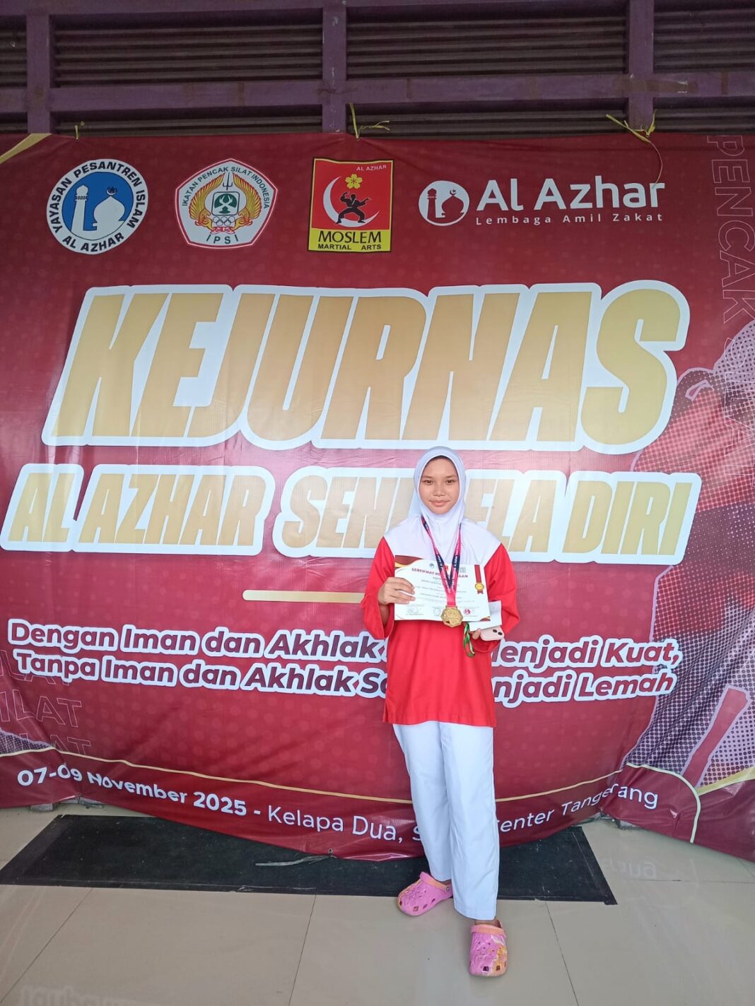 Tangerang, SUARABUANA.com – Prestasi membanggakan kembali diraih oleh Keysha Adlina Az-Zalfa Putri DJ, yang sukses meraih Juara Pertama dan Medali Emas dalam ajang Kejuaraan Nasional (Kejurnas) Seni Bela Diri Pencak Silat Al Azhar 2025.