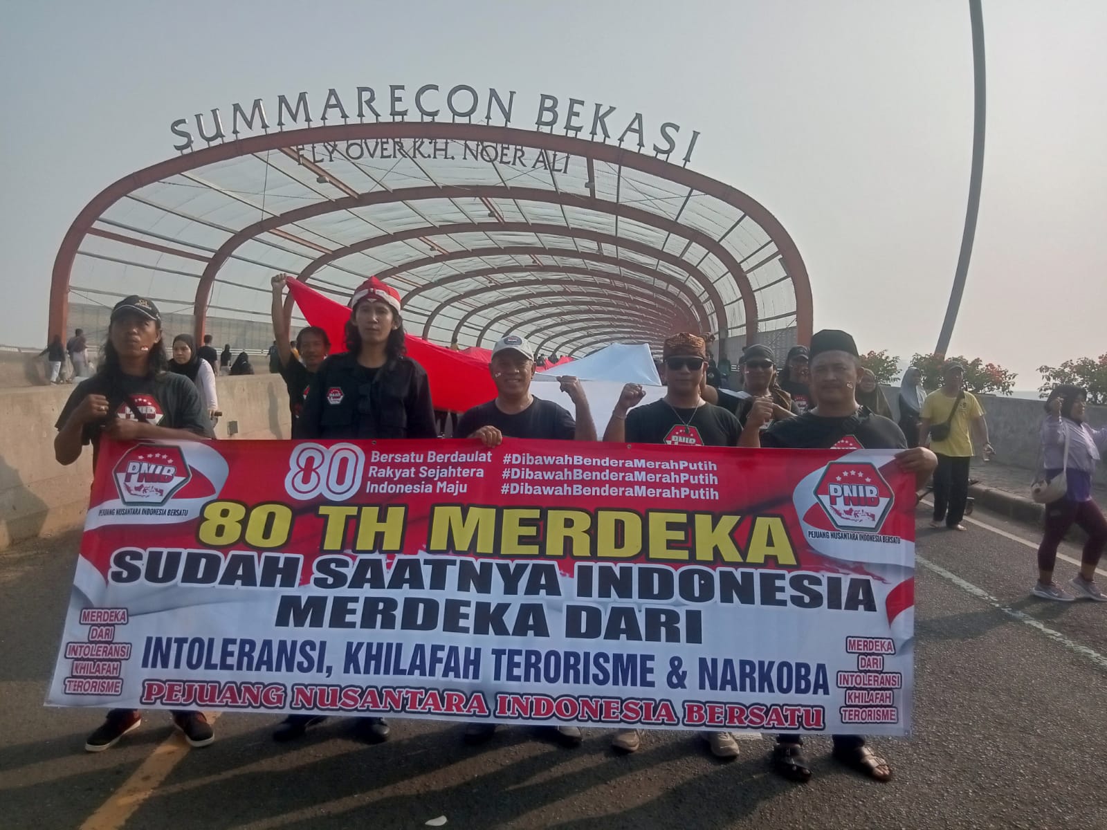 Spanduk bertuliskan “80 Tahun Merdeka, sudah saatnya Indonesia merdeka dari Intoleransi, khilafah, terorisme dan narkoba”. Menurut Gus Wal menjadi thema kirab kali ini di Bekasi mengusung spirit kemerdekaan.
