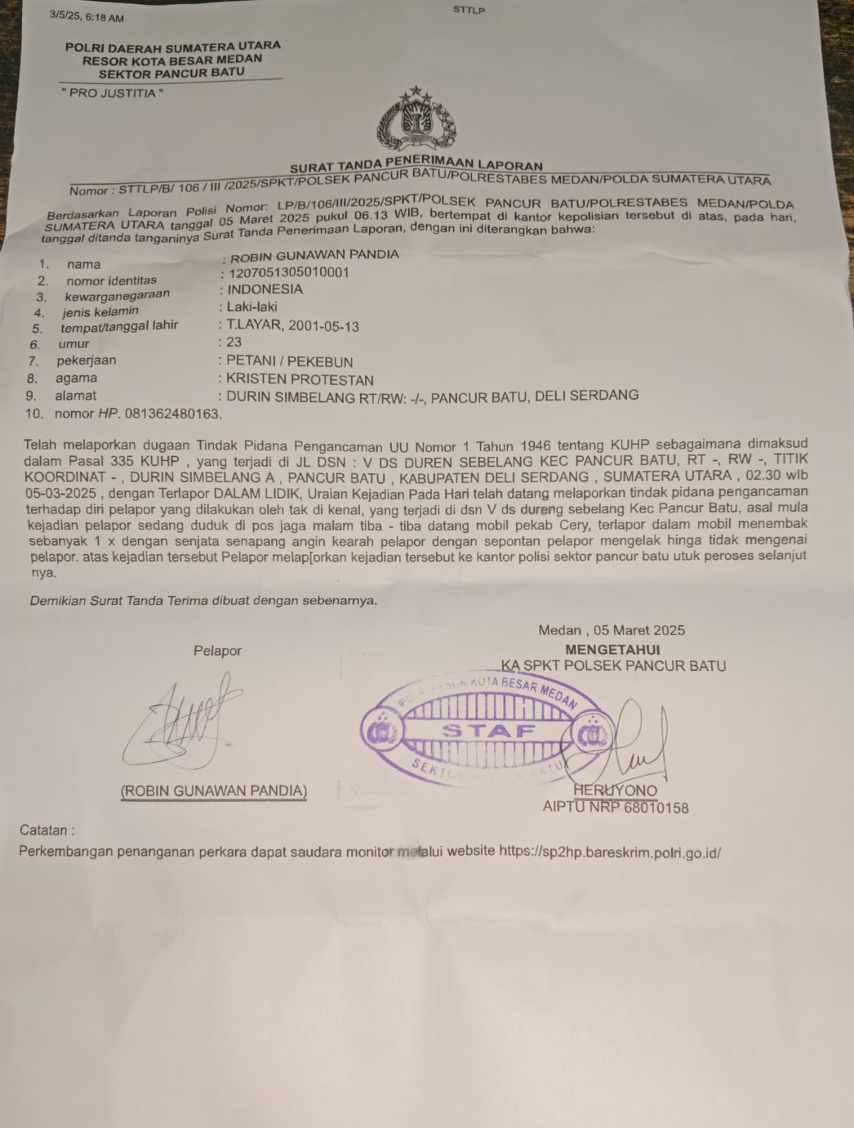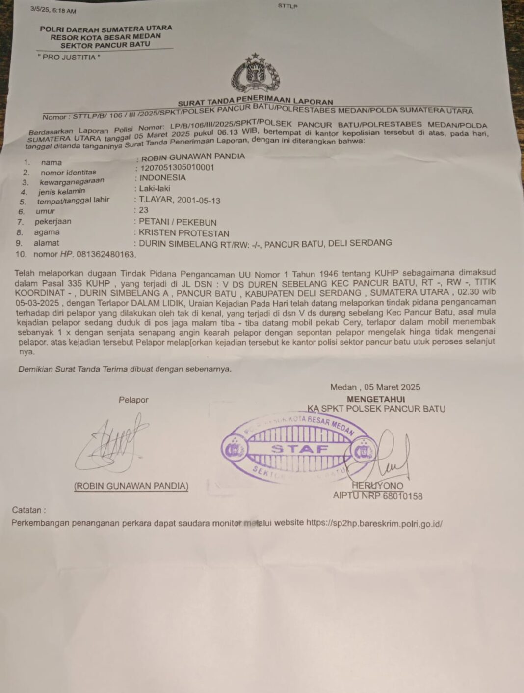 Kasus tersebut tercatat dalam Laporan Polisi Nomor: LP/B/106/III/2025/SPKT/Polsek Pancur Batu/Polrestabes Medan/Polda Sumatera Utara.