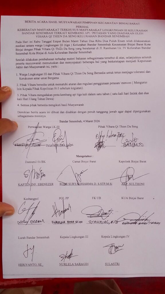 Binjai, SUARABUANA.com Mediasi perdana konflik Klenteng Thai Seng Hut Co di Binjai Barat bersama Warga lingkungan 3 yang digelar pada Rabu (4/3/26) dihadiri langsung oleh Ketua Pengurus Klenteng Elton Hotman bersama rekannya dan kubu warga yang berseteru di Kantor Kelurahan Bandar Sinembah, Kec. Binjai Barat, Kota Binjai.