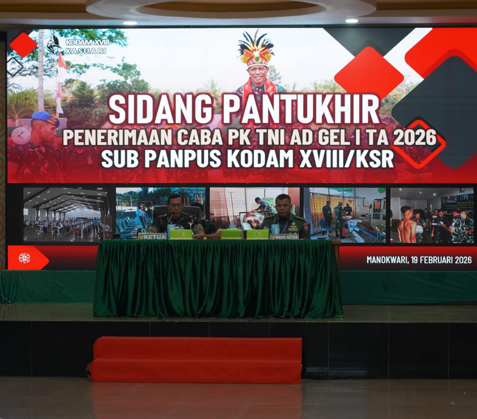 Pangdam XVIII/Kasuari, Mayjen TNI Christian Kurnianto Tehuteru, memimpin langsung Sidang Pemilihan Tingkat Sub Panitia Pusat (Sub Panpus) Penerimaan Calon Bintara Prajurit Karier (Caba PK) TNI AD Gelombang I Tahun Anggaran 2026 di Aula Makodam, Manokwari, Papua Barat, Kamis (19/2-2026), diikuti oleh 104 calon.