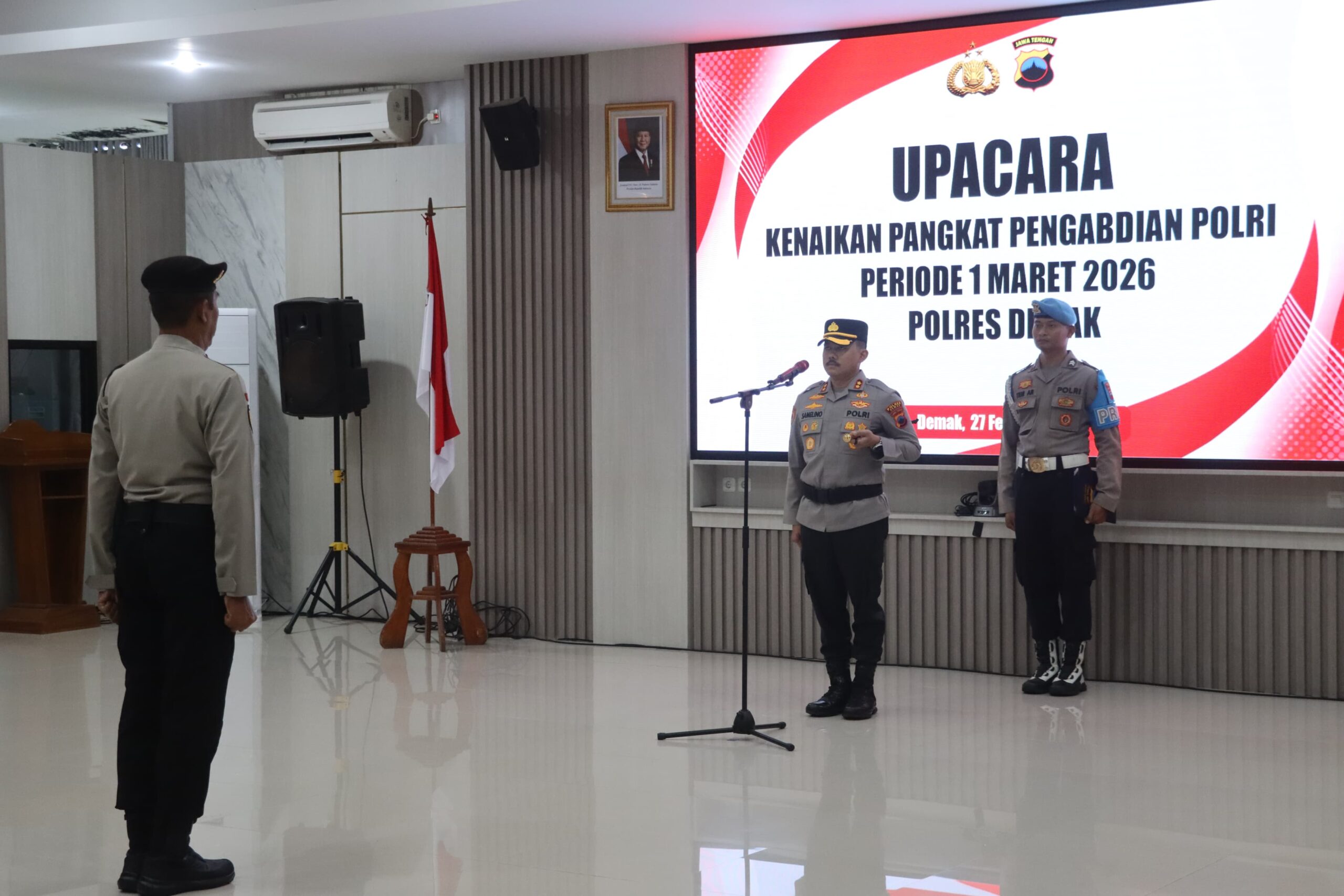 Demak, SUARABUANA.com Polres Demak menggelar upacara kenaikan pangkat pengabdian periode 1 Maret 2026 di Aula Wicaksana Laghawa, Jumat (27/2/2026). Kegiatan tersebut diikuti pejabat utama, para Kapolsek jajaran, Ketua Pengurus Bhayangkari Cabang Demak beserta pengurus, serta personel Polres Demak.