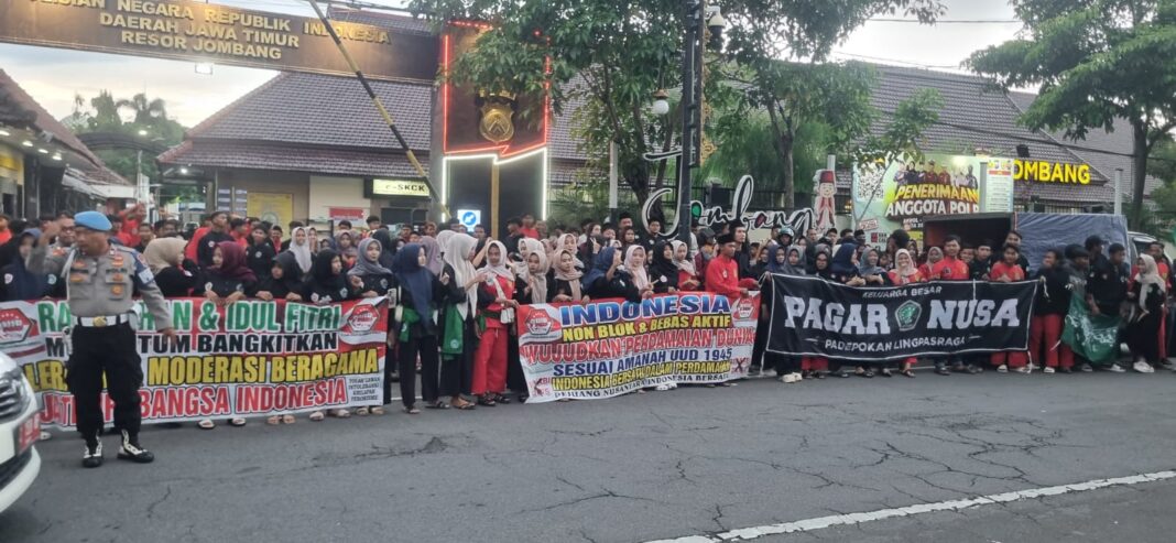 Jombang, SuaraBuana.com_ Organisasi masyarakat lintas agama, budaya, dan tradisi Pejuang Nusantara Indonesia Bersatu (PNIB) bersama Pagar Nusa Padepokan Lingpasraga kembali menggelar aksi sosial berbagi takjil dijawasan Jl Gus Dur Jombang, Tepatnya didepan Mapolres Jombang, Selasa (17/3/2026). Kegiatan ini menjadi bagian dari refleksi Ramadhan sekaligus seruan menjaga perdamaian, toleransi, serta memperkuat persatuan Indonesia Kerukunan anak bangsa.