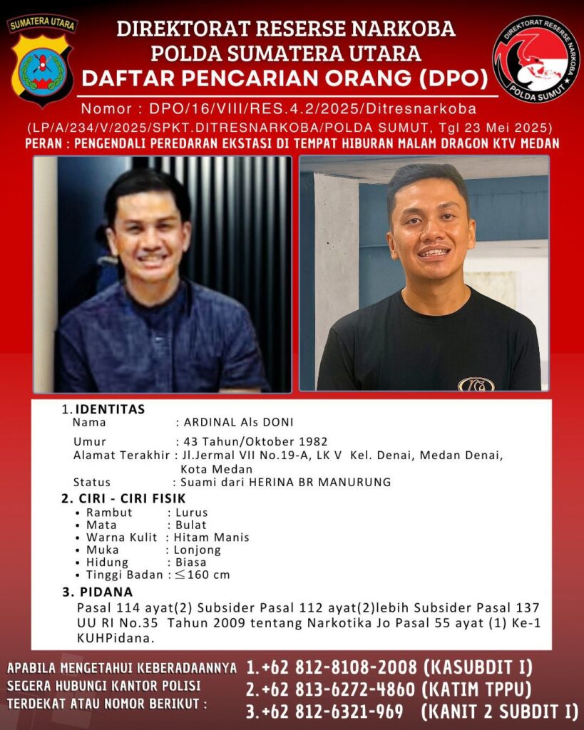 Penetapan DPO terhadap Ardinal dan Herina tercatat dalam surat resmi Ditresnarkoba Polda Sumut dengan nomor DPO/16/VIII/RES.4.2/2025 untuk Ardinal dan DPO/17/VIII/RES.4.2/2025 untuk Herina. Keduanya dijerat dengan Pasal 114 ayat (2), subsider Pasal 112 ayat (2), lebih subsider Pasal 137 UU RI No. 35 Tahun 2009 tentang Narkotika, serta Pasal 55 ayat (1) ke-1 KUHPidana.
