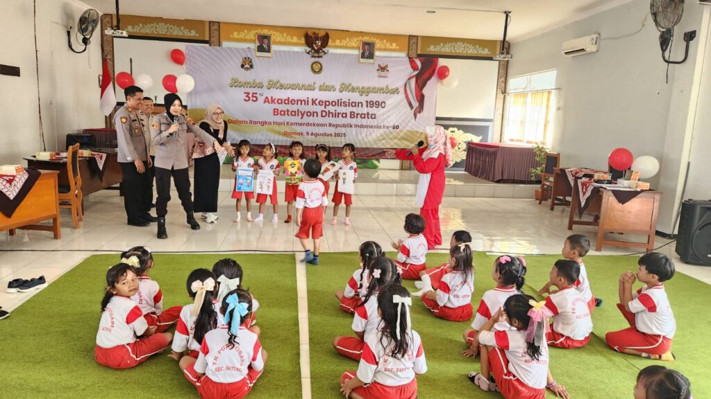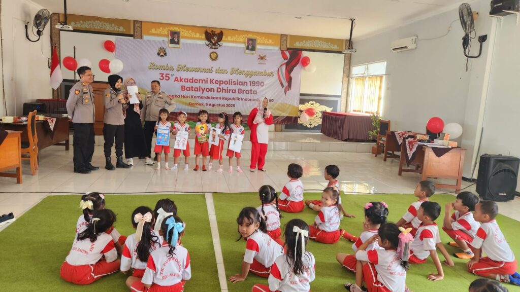Demak, SUARABUANA.com – Dalam rangka menyambut Hari Ulang Tahun (HUT) RI ke-80 Tahun, Polsek Sayung Polres Demak dan alumni Akpol 90 ke 35 Batalyon Dhira brata, menggelar lomba menggambar dan mewarnai di Aula Kecamatan Sayung Kabupaten Demak, Sabtu (9/8/2025).Dalam kegiatan tersebut diikuti oleh anak-anak yang di dominasi Taman Kanak-kanak Desa Purwosari.