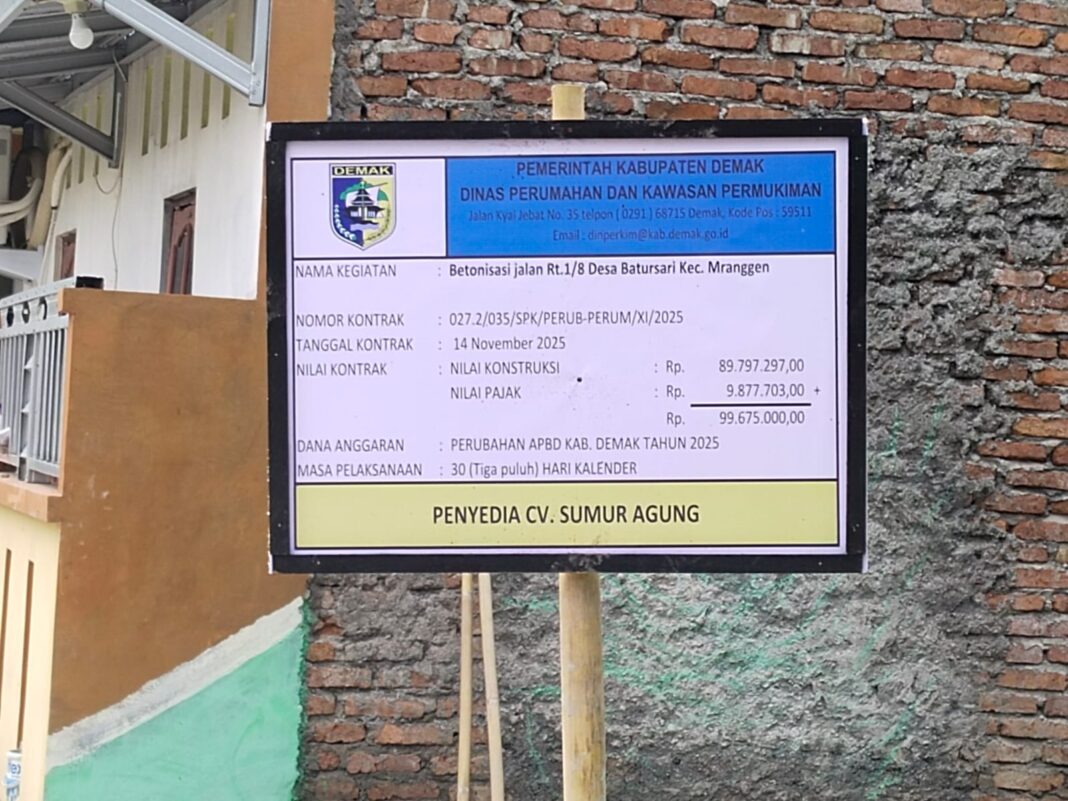 Demak, SUARABUANA.com Proyek pembangunan betonisasi jalan di RT.01 RW.08 Dukuh Tlogo, Desa Batursari, Kecamatan Mranggen, Kabupaten Demak, yang dibiayai dari anggaran APBD Perubahan senilai Rp. 99.675.000.00, dan dikerjakan oleh CV. Sumber Agung, kini menjadi sorotan karena dugaan pengerjaan yang tidak sesuai standar.