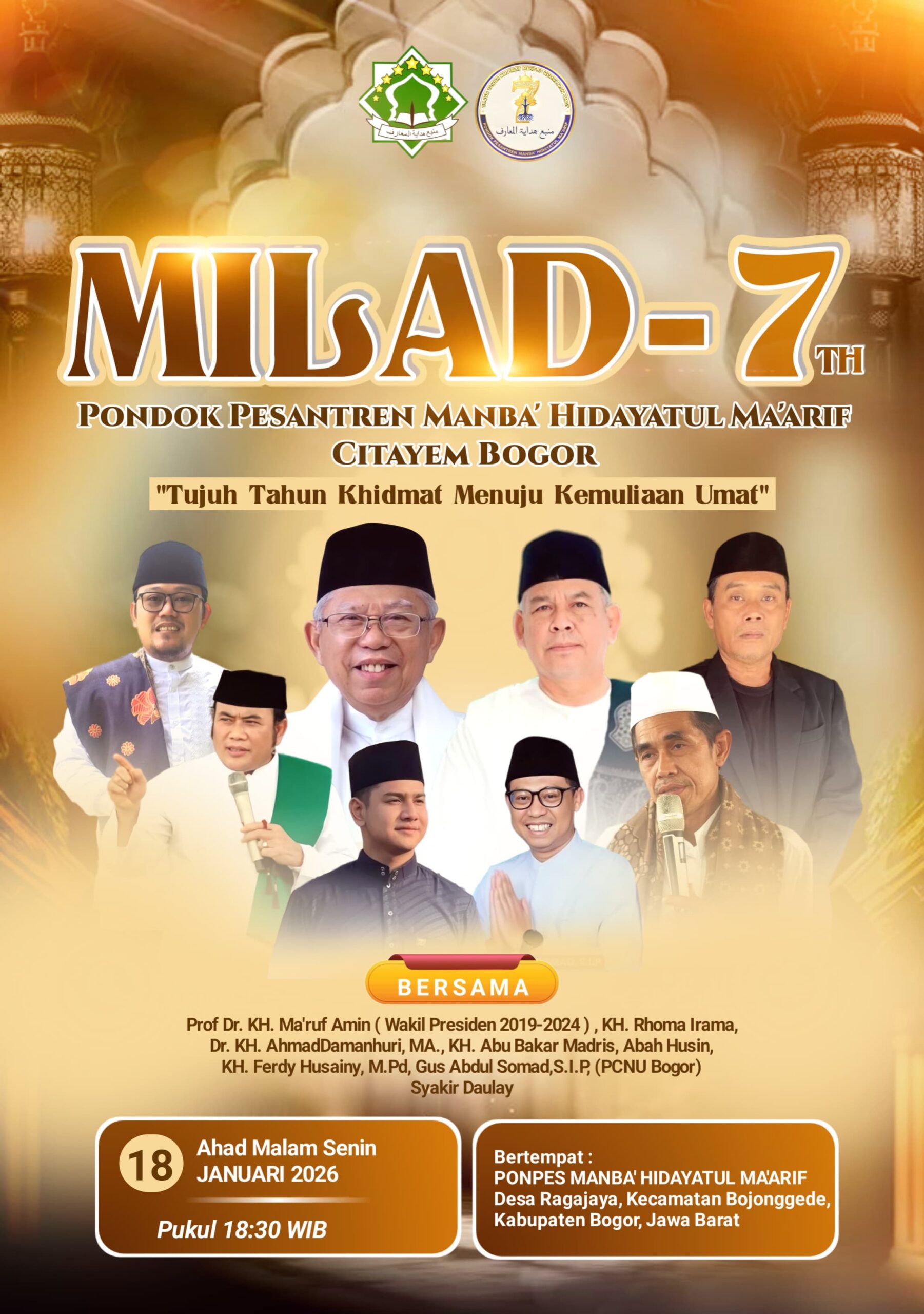 Kabupaten Bogor, SUARABUANA.com Pondok Pesantren Manba Hidayatul Ma’arif akan menggelar Milad(Ulang Tahun) ke 7 pada Minggu 18 Januari 2026. Acara ini akan dihadiri oleh puluhan Kyai dan Mubaligh, diantaranya Prof Dr KH Maruf Amin(Mantan Wapres RI) KH Dr(Hc) Rhoma Irama,Dr KH Damanhuri MA, KH Drs Abu Bakar Madris, Abah Husin, Gus Abdul Shomad S.IP(PC NU Bogor, Syakir Daulay dan tentu saja Pimpinan Ponpes MAHIMA KH Ferdy Al Husainy M.Pd serta beberapa Ulama lainnya.