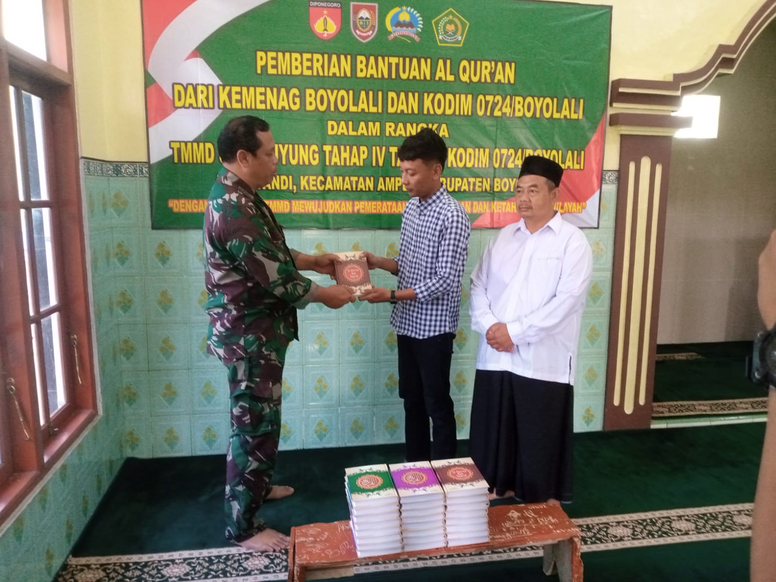 Dalam kesempatan tersebut, Kapten Yanu menyampaikan bahwa pemberian Al-Qur’an ini merupakan wujud kepedulian TNI terhadap kehidupan beragama di masyarakat. Selain untuk mempererat kemanunggalan TNI dengan rakyat, kegiatan ini juga diharapkan dapat menumbuhkan semangat beribadah serta meningkatkan keimanan dan ketakwaan umat Islam.