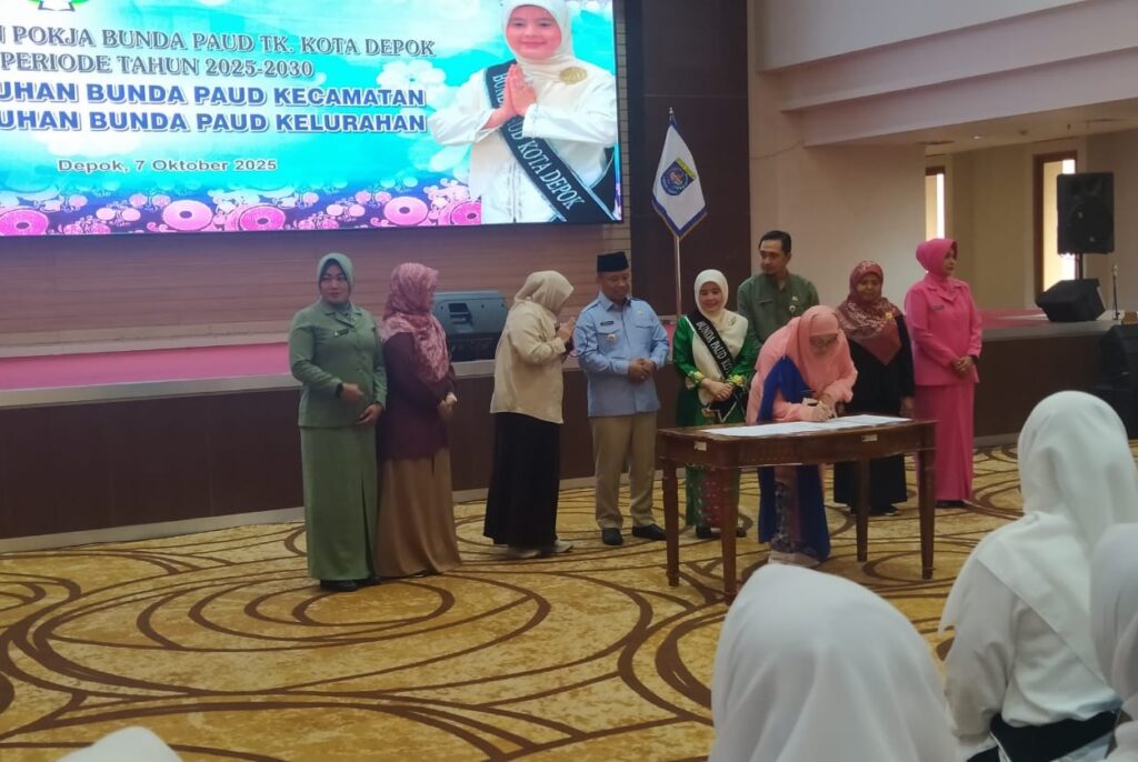 Depok, SUARABUANA.com — Walikota Depok, Supian Suri menghadiri pelantikan Kelompok Kerja (Pokja) Bunda Pendidikan Anak Usia Dini (PAUD) serta pengukuhan Bunda PAUD Kecamatan dan Kelurahan tingkat Kota Depok Periode 2025 s/d 2030 di Gedung Dibaleka II Lt 10, Balaikota Depok pada Selasa (07/10/2025).Dalam kesempatan tersebut, Walikota menegaskan bahwa pelantikan ini bukan sekadar jabatan, melainkan amanah yang harus dijalankan dengan penuh tanggungjawab. “Ini bukan jabatan, tetapi amanah. Jangan sampai terbawa suasana seremonial, namun lupa dengan program-programnya,” ujarnya di sela kegiatan.