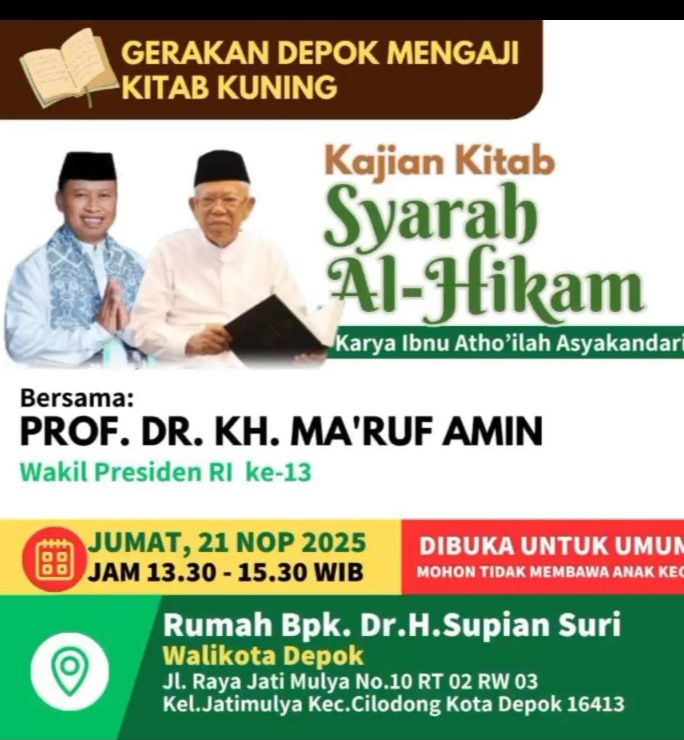 Depok, SUARABUANA.com – Dalam rangka Gerakan Depok mengaji Kitab Kuning, Walikota Depok Dr.H.Supian Suri MM akan menyelenggarakan kajian Kitab Syarah Al-Hikam pada hari Jumat 21 November 2025 dan akan dimulai pukul 13.30 Wib bertempat di Kediaman Beliau di Kawasan Kp.Sawah Serab Kelurahan Jatimulya Kecamatan Cilodong Kota Depok.